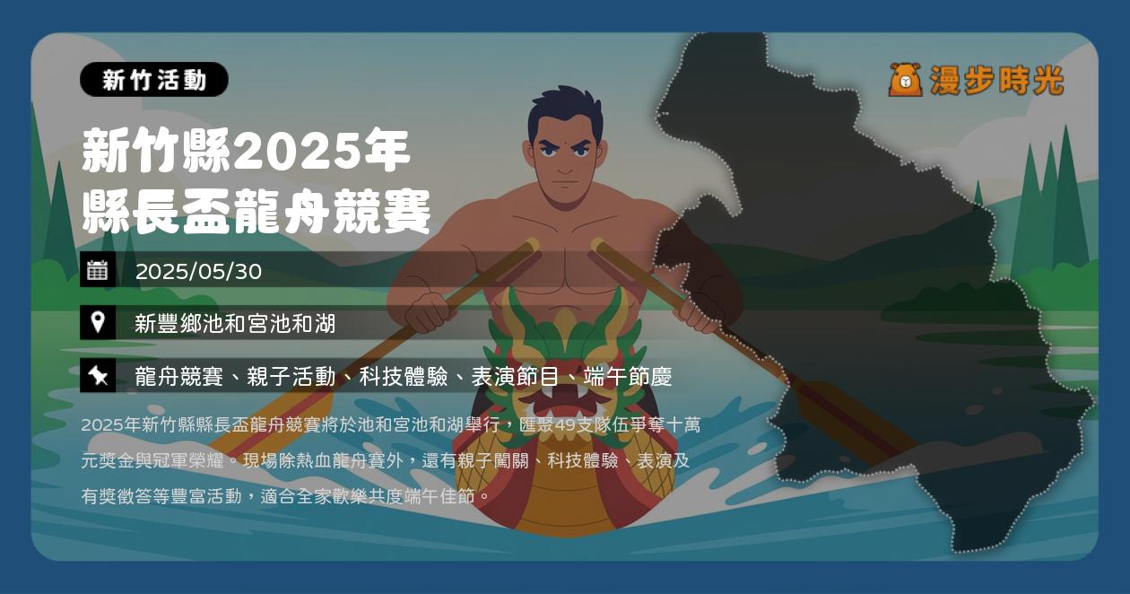 2025年新竹縣縣長盃龍舟競賽將於池和宮池和湖舉行,匯聚49支隊伍爭奪十萬元獎金與冠軍榮耀。現場除熱血龍舟賽外,還有親子闖關、科技體驗、表演及有獎徵答等豐富活動,適合全家歡樂共度端午佳節。