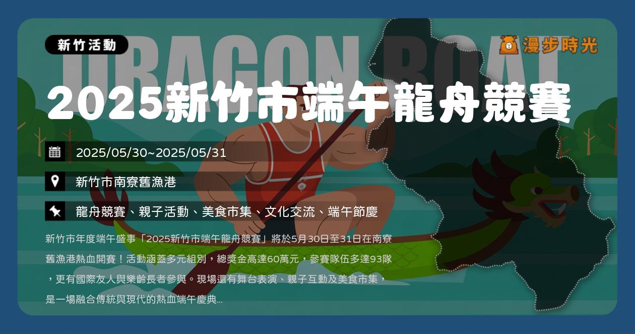 2025新竹市端午龍舟競賽活動的時間為2025年5月30日~2025年5月31日,地點在新竹市南寮舊漁港。新竹市年度端午盛事「2025新竹市端午龍舟競賽」將於5月30日至31日在南寮舊漁港熱血開賽!活動涵蓋多元組別,總獎金高達60萬元,參賽隊伍多達93隊,更有國際友人與樂齡長者參與。現場還有舞台表演、親子互動及美食市集,是一場融合傳統與現代的熱血端午慶典。