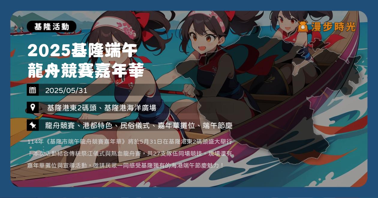 2025基隆端午龍舟競賽嘉年華活動的時間為2025年5月31日,地點在基隆港東2碼頭、基隆港海洋廣場。本次活動結合傳統祭江儀式與熱血龍舟賽,共27支隊伍同場競技。現場還有嘉年華攤位與宣導活動,邀請民眾一同感受基隆獨有的海港端午節慶魅力!