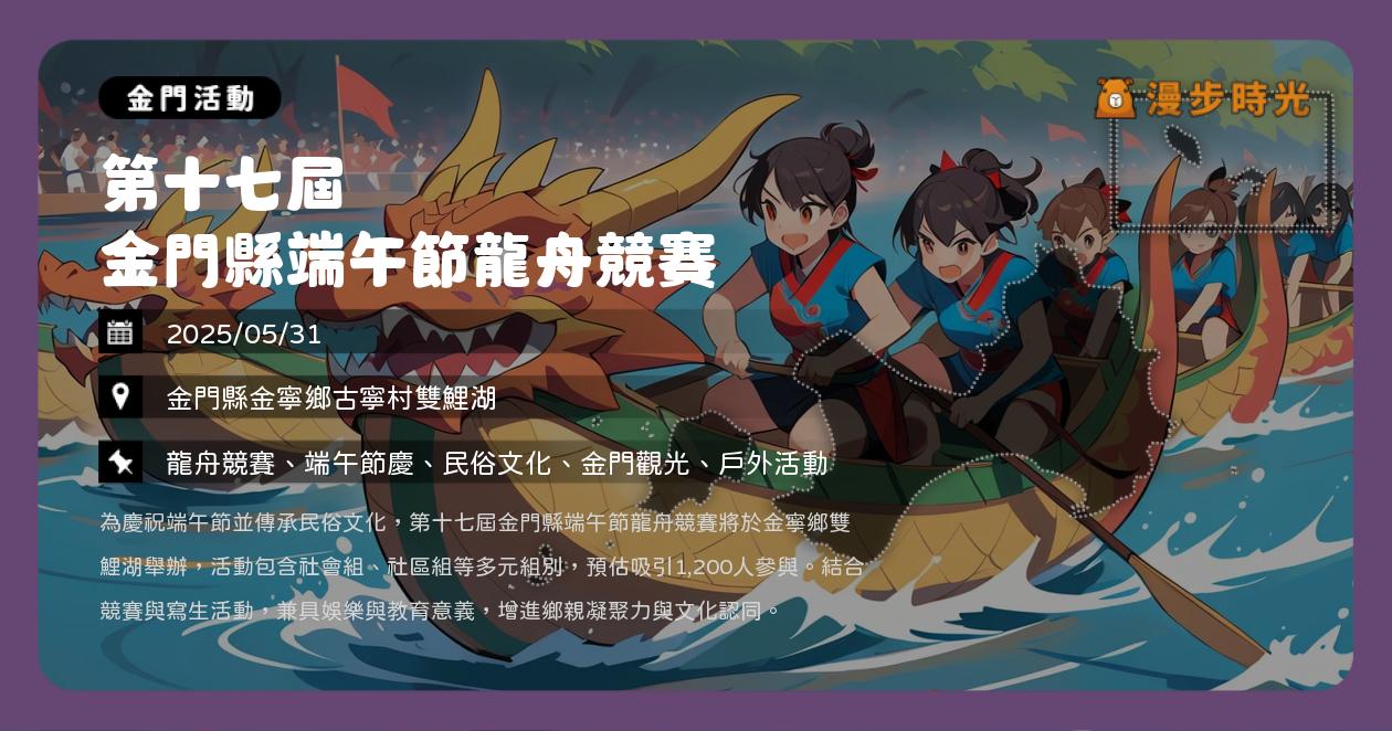 2025金門縣第十七屆端午節龍舟競賽的時間為2025年05月31日,地點在金門縣金寧鄉古寧村雙鯉湖。此活動由金門縣政府與金門縣議會主辦,金門縣立體育場承辦,旨在慶祝端午佳節,弘揚傳統民俗技藝,並促進縣內觀光與民眾參與。活動從上午8時至下午5時,包含社會男子組、社區男子組與社會女子組等競賽組別。預估參與人數可達1,200人,現場除了激烈的龍舟競賽外,也安排寫生活動,期望透過多元形式強化文化傳承與教育意義。