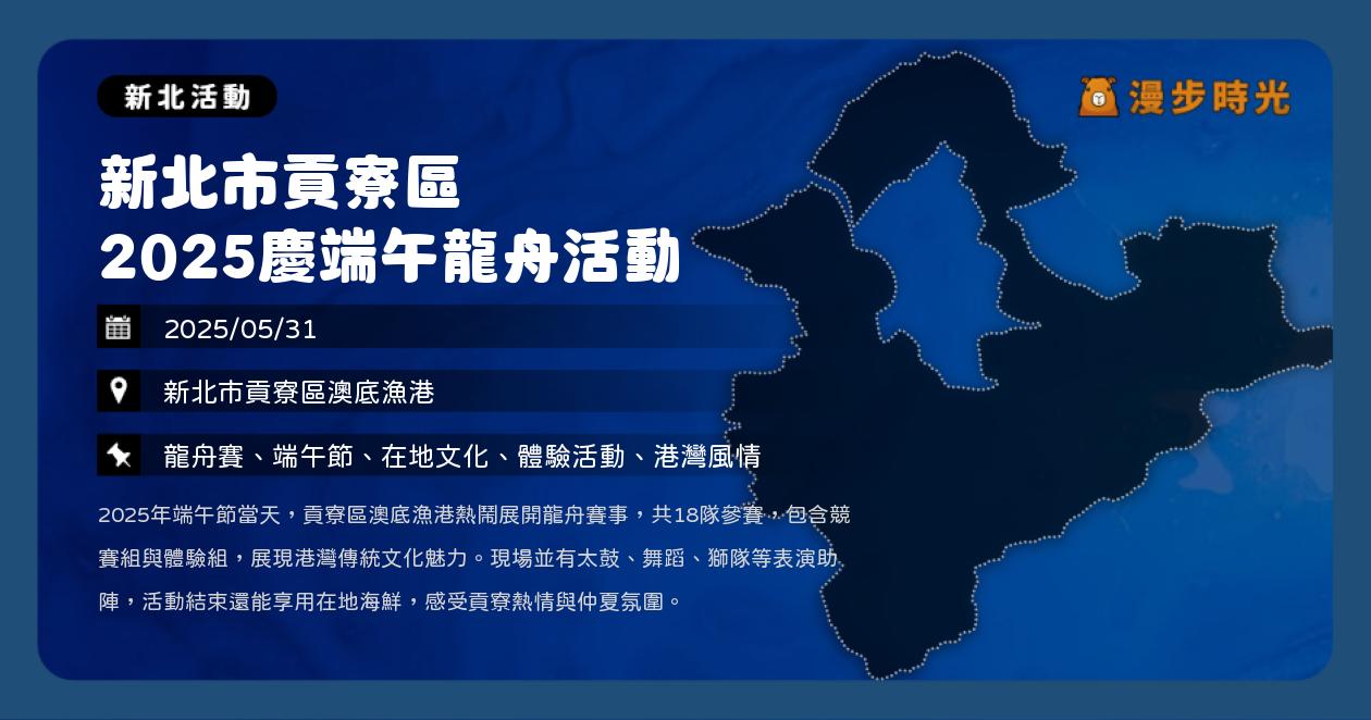 新北市貢寮區2025慶端午龍舟活動活動的時間為2025年5月31日,地點在新北市貢寮區澳底漁港。2025年端午節當天,貢寮區澳底漁港熱鬧展開龍舟賽事,共18隊參賽,包含競賽組與體驗組,展現港灣傳統文化魅力。現場並有太鼓、舞蹈、獅隊等表演助陣,活動結束還能享用在地海鮮,感受貢寮熱情與仲夏氛圍。