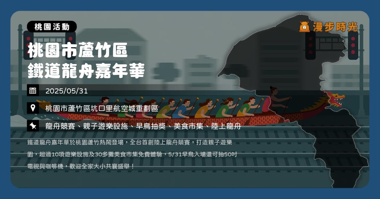 桃園市蘆竹區鐵道龍舟嘉年華的時間為2025年5月31日,地點在桃園市蘆竹區航空城重劃區。活動當日除了充滿創意的陸上龍舟競賽,更設有免費親子遊樂設施與熱鬧的市集,打造適合全家大小共遊的端午盛典。本次活動最大亮點為全國首創的「鐵道龍舟競賽」,顛覆傳統水上比賽模式,改以陸地進行,讓不擅水性的民眾也能一同體驗龍舟樂趣。活動當日早上08:00至08:50將開放限量摸彩券領取,每人限領一張,並於08:55前投入摸彩箱,就有機會抽中50吋液晶電視、自動研磨咖啡機等大獎。除競賽與抽獎外,現場還設有18人海盜船、噴火龍氣墊城堡、旋轉飛機等超過十項免費遊樂設施,以及超過30攤的美食市集,提供豐富的吃喝玩樂體驗,是親子假日出遊的最佳選擇。