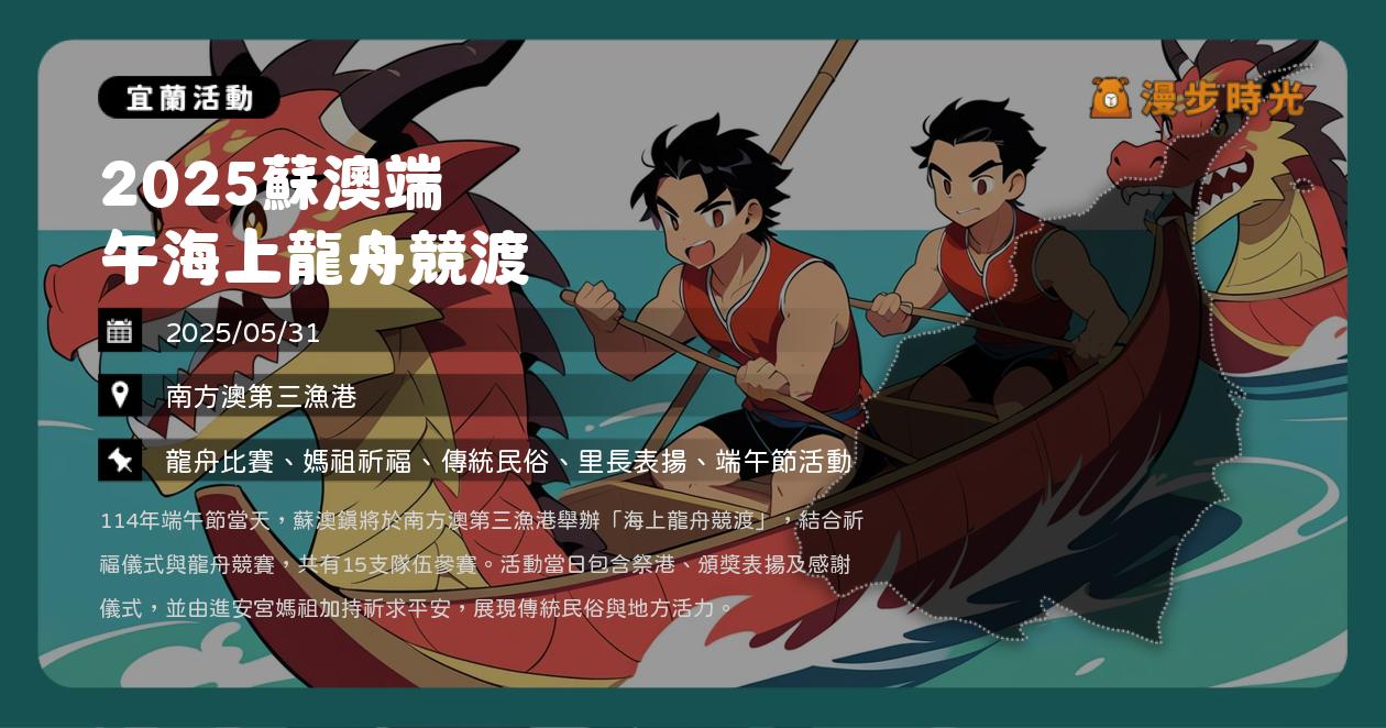 蘇澳端午海上龍舟競渡的時間為2025年05月31日,地點在南方澳第三漁港(進安宮前)。活動當天上午10點將舉行隆重的開幕式與祈福儀式,由南方澳進安宮擔任輪值母廟,象徵對地方的祝福與庇佑。此次活動包含社會男子組及男女混合組,共15支隊伍參賽,展現團結與體力的海上盛會。本次競渡除了比賽精彩,現場也同步進行「績優表揚」頒獎儀式。此外,活動從清晨5:30即展開傳統「祭港」儀式,並於當日下午5:00圓滿落幕。
