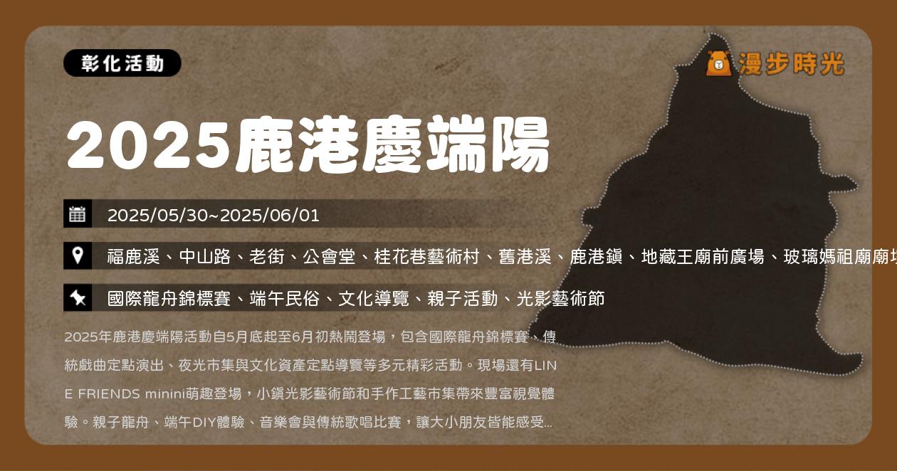 鹿港慶端陽活動的時間為2025年5月30日~2025年6月2日,地點在彰化縣鹿港鎮,活動地點涵蓋鹿港河岸綠地、龍山寺、鹿港老街等歷史文化景點。活動內容豐富多元,包含經典的鹿港龍舟賽、傳統戲曲展演、河岸綠地音樂會、民俗體驗、集章換禮與導覽解說等,邀請民眾一同感受濃濃端午氛圍。今年的河岸綠地音樂會是活動一大亮點,從5月30日連續三晚邀請藝人輪番登台,包括小丑魔術師蔡明佑、薩克斯風樂團「灣子口」、實力派歌手林育澤以及「聲林之王」出身的鄭怡琳壓軸演出,讓鹿港的夏夜增添精彩聲色。演出內容也融入國際風格,特別安排「南非黑人秀」、「川劇變臉秀」等精采節目,融合在地文化與多元藝術。