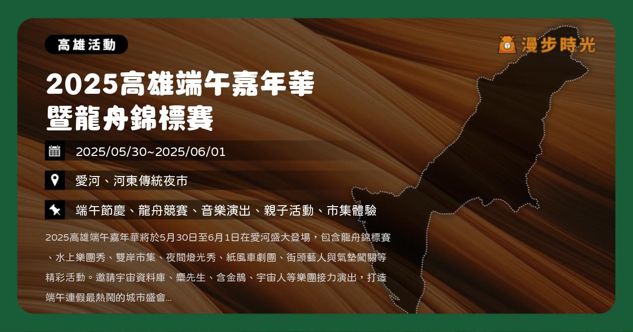 2025高雄端午嘉年華暨龍舟錦標賽的時間為2025年5月30日~2025年6月1日,地點在高雄市愛河沿岸舉行。今年活動亮點包含162隊參賽創歷年新高,國際府會交流戰升級為3.0版,並有多位網紅及職棒運動員組隊參與競賽。此外,水上音樂派對邀請金曲樂團麋先生、宇宙人等壓軸演出,夜間更有雙龍燈光秀與親子劇場。除正規競賽外,也安排了全民親子龍舟體驗、文創與美食市集、水上與陸上氣墊遊戲等活動,適合各年齡層參與,預計吸引大量民眾造訪,延續去年度超過26萬人次的佳績。