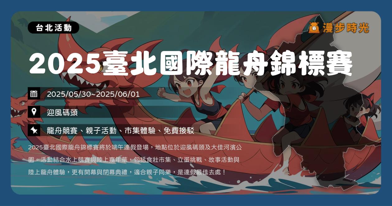 2025臺北國際龍舟錦標賽的時間為2025年5月30日~2025年6月1日,地點在迎風碼頭。活動適逢端午連假,不僅有精彩的龍舟競賽,更結合親子體驗、市集娛樂與文化活動,提供民眾一場結合傳統與創新的端午盛會。活動期間,迎風碼頭將化身為熱鬧的嘉年華場地,包含「食壯市集」、「舞台表演」、「龍舟小選手體驗營」、「飛車立蛋挑戰賽」、「端午立蛋活動」及「說故事姐姐講端午」等一系列節目。觀眾不僅能觀賞龍舟競賽,還能親身參與陸上龍舟體驗,讓大人小孩都能感受划槳的樂趣。