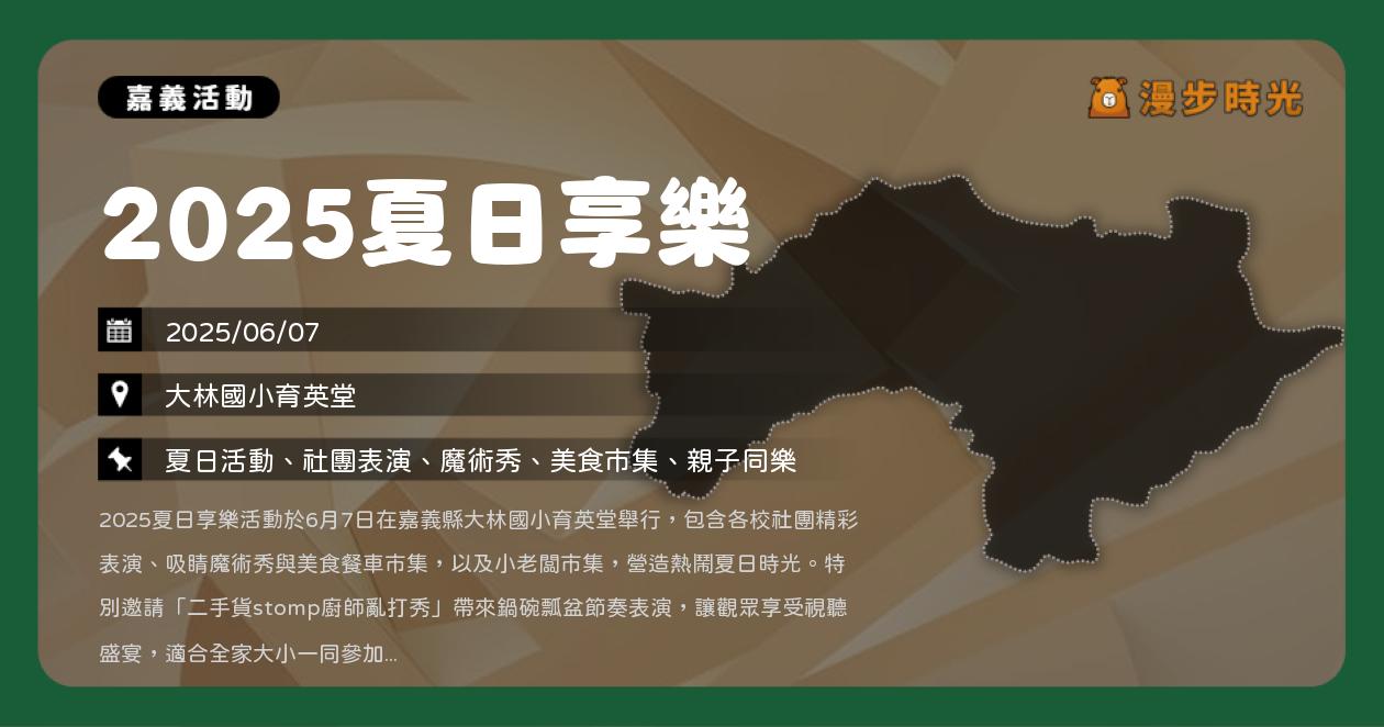 2025夏日享樂活動於6月7日在嘉義縣大林國小育英堂舉行,包含各校社團精彩表演、吸睛魔術秀與美食餐車市集,以及小老闆市集,營造熱鬧夏日時光。特別邀請「二手貨stomp廚師亂打秀」帶來鍋碗瓢盆節奏表演,讓觀眾享受視聽盛宴,適合全家大小一同參加。