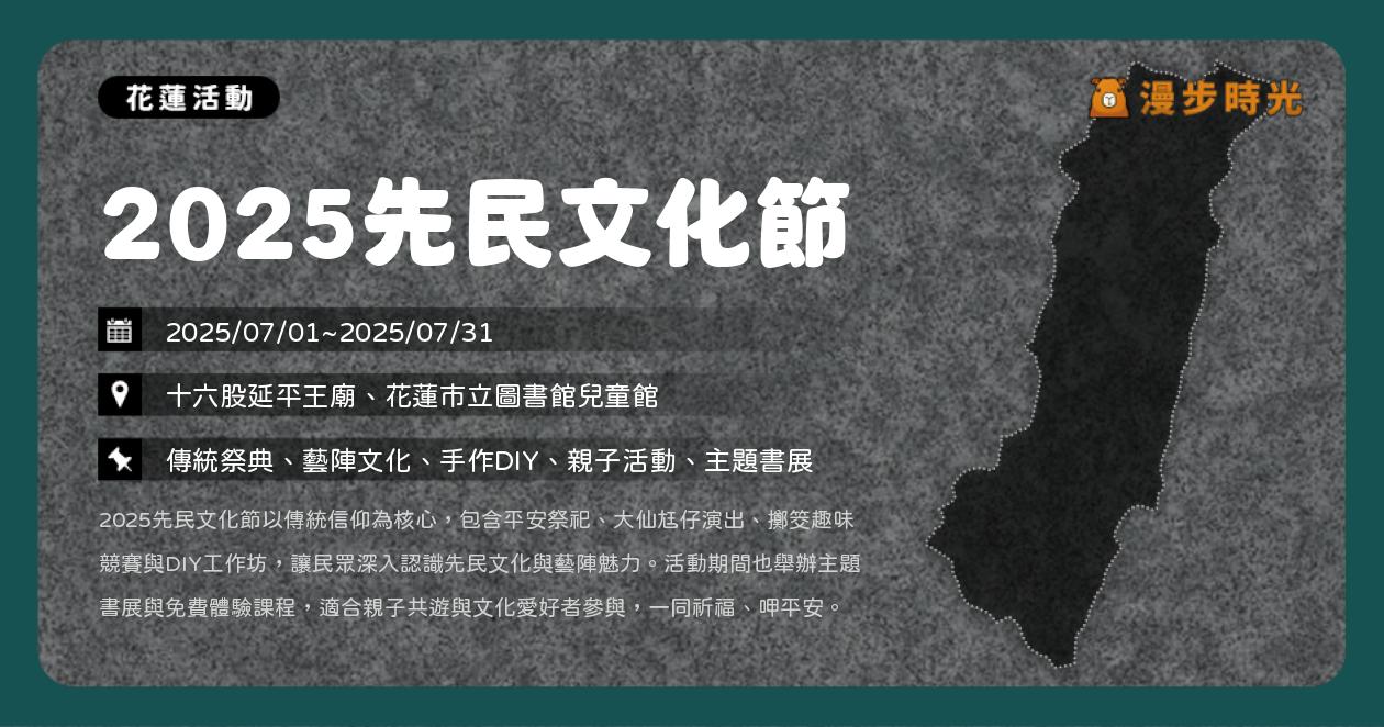 | 主活動-先民文化節典禮 | 2025/08/02 | 15:00~ | 十六股延平王廟(花蓮市豐村72號) | 平安祭祀、大神將演出、香火袋祈福、平安粥、擲筊競賽等民俗儀式 | – |