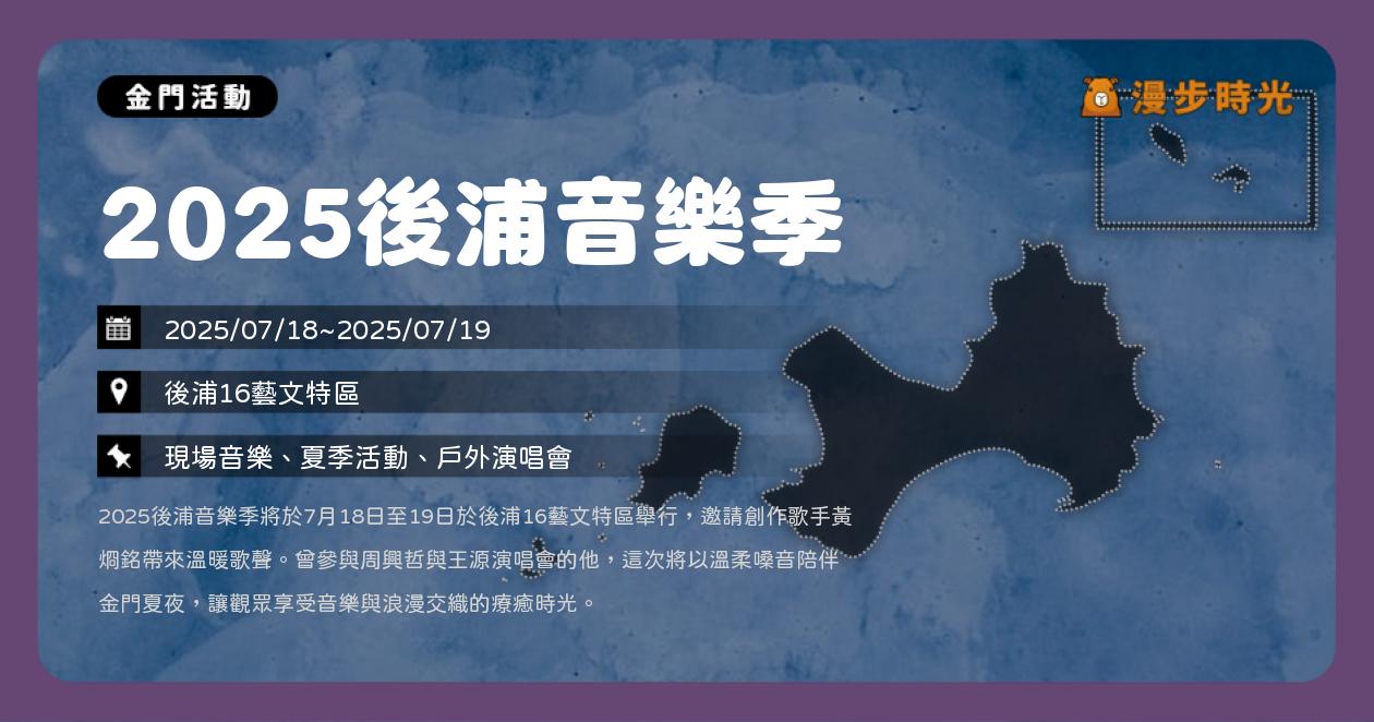 | 後浦音樂季演出 | 2025/07/11~08/30 | 19:30~21:00 | 金城後浦16藝文特區 | 每週五、六晚間音樂演出,包含WiZY&相合、潤潁Ruenying等多組表演 | – |