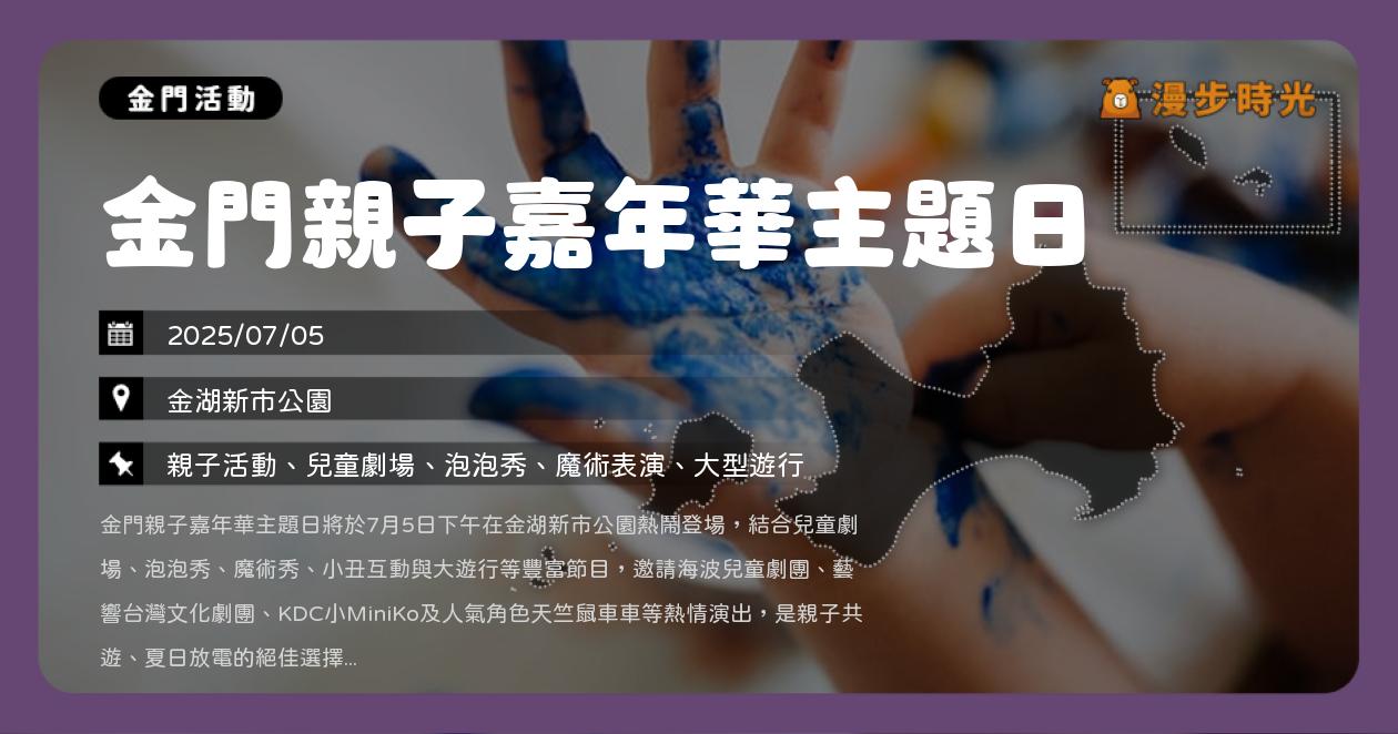 金門親子嘉年華主題日將於7月5日下午在金湖新市公園熱鬧登場,結合兒童劇場、泡泡秀、魔術秀、小丑互動與大遊行等豐富節目,邀請海波兒童劇團、藝響台灣文化劇團、KDC小MiniKo及人氣角色天竺鼠車車等熱情演出,是親子共遊、夏日放電的絕佳選擇。