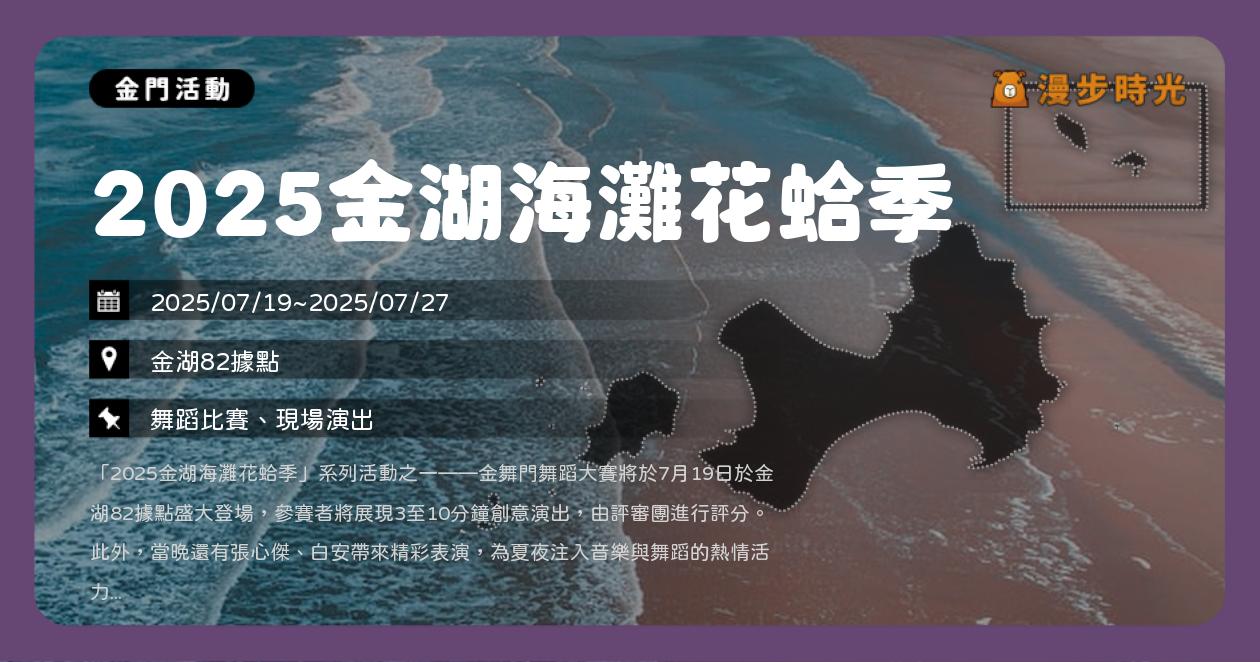 「2025金湖海灘花蛤季」系列活動之一——金舞門舞蹈大賽將於7月19日於金湖82據點盛大登場,參賽者將展現3至10分鐘創意演出,由評審團進行評分。此外,當晚還有張心傑、白安帶來精彩表演,為夏夜注入音樂與舞蹈的熱情活力。