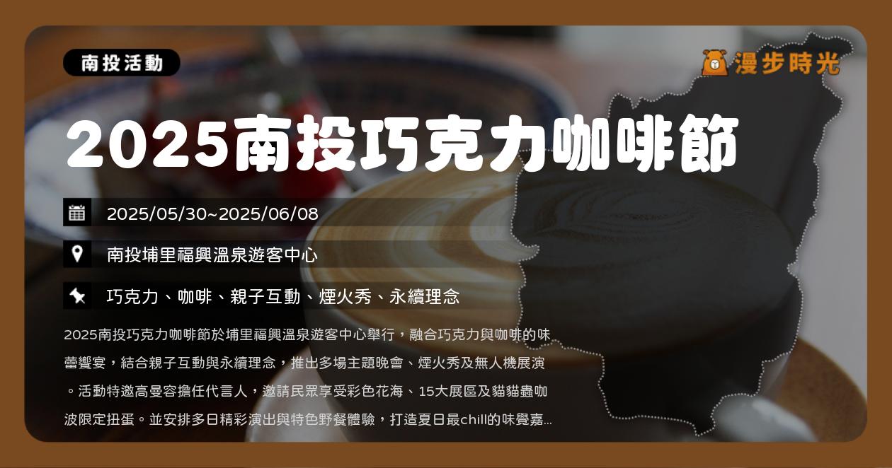 2025南投巧克力咖啡節於埔里福興溫泉遊客中心舉行,融合巧克力與咖啡的味蕾饗宴,結合親子互動與永續理念,推出多場主題晚會、煙火秀及無人機展演。活動特邀高曼容擔任代言人,邀請民眾享受彩色花海、15大展區及貓貓蟲咖波限定扭蛋。並安排多日精彩演出與特色野餐體驗,打造夏日最chill的味覺嘉年華。