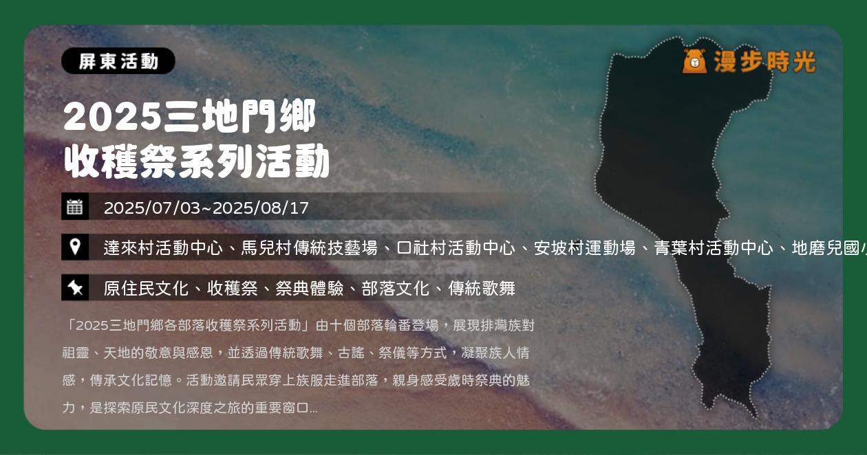 2025三地門鄉各部落收穫祭系列活動的時間為2025年07月03日~2025年08月17日,地點在屏東縣三地門鄉各部落聚會所及活動中心。這是一場延續傳統與族群文化記憶的重要祭典,也是一年一度由族人共同參與的歲時祭儀。