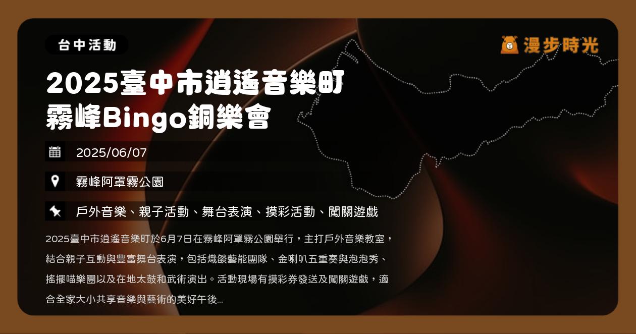 2025臺中市逍遙音樂町 霧峰Bingo銅樂會活動的時間為2025年6月7日,地點在霧峰阿罩霧公園。2025臺…