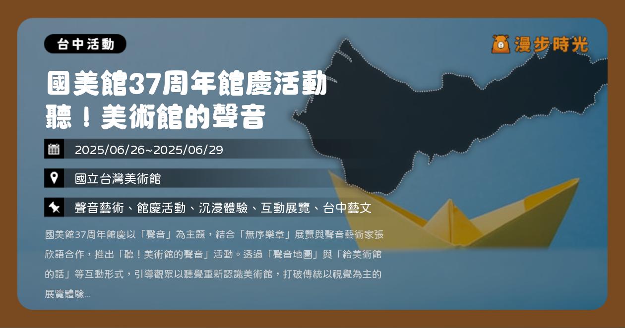 國立臺灣美術館「聽!美術館的聲音」活動的時間為2025年06月26日~2025年06月29日,地點在國立臺灣美術館館內各展演空間舉行,包含觀眾休息區與多處聆聽角落。本次活動為慶祝國美館37周年館慶,透過聲音藝術與觀眾互動體驗,帶來不同以往的美術館感知之旅。