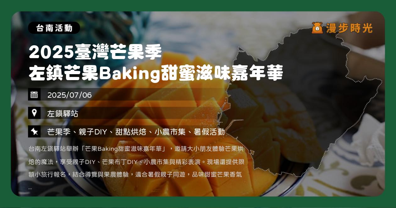 2025臺灣芒果季-左鎮登場活動的時間為2025年07月06日,地點在臺南市左鎮驛站舉辦。活動主題為「芒果Baking.甜蜜滋味嘉年華」,結合烘焙DIY、藝文展演、小農市集及深度小旅行,讓民眾從產地出發,深入認識左鎮的農村魅力與芒果文化。