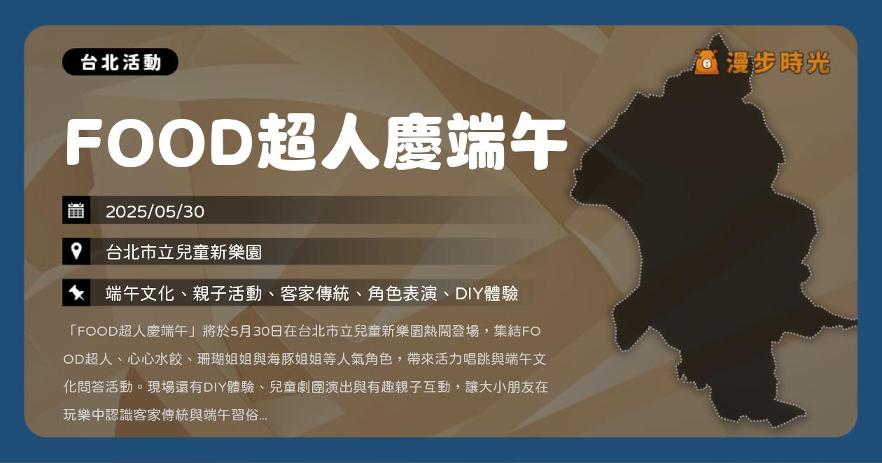 FOOD超人慶端午的時間為2025年05月30日,地點在台北市立兒童新樂園。本次活動由台北市政府客家事務委員會主辦,融合端午節的傳統文化與親子娛樂內容,邀請所有大小朋友一同參與「粽夏个時節」的熱鬧慶典。