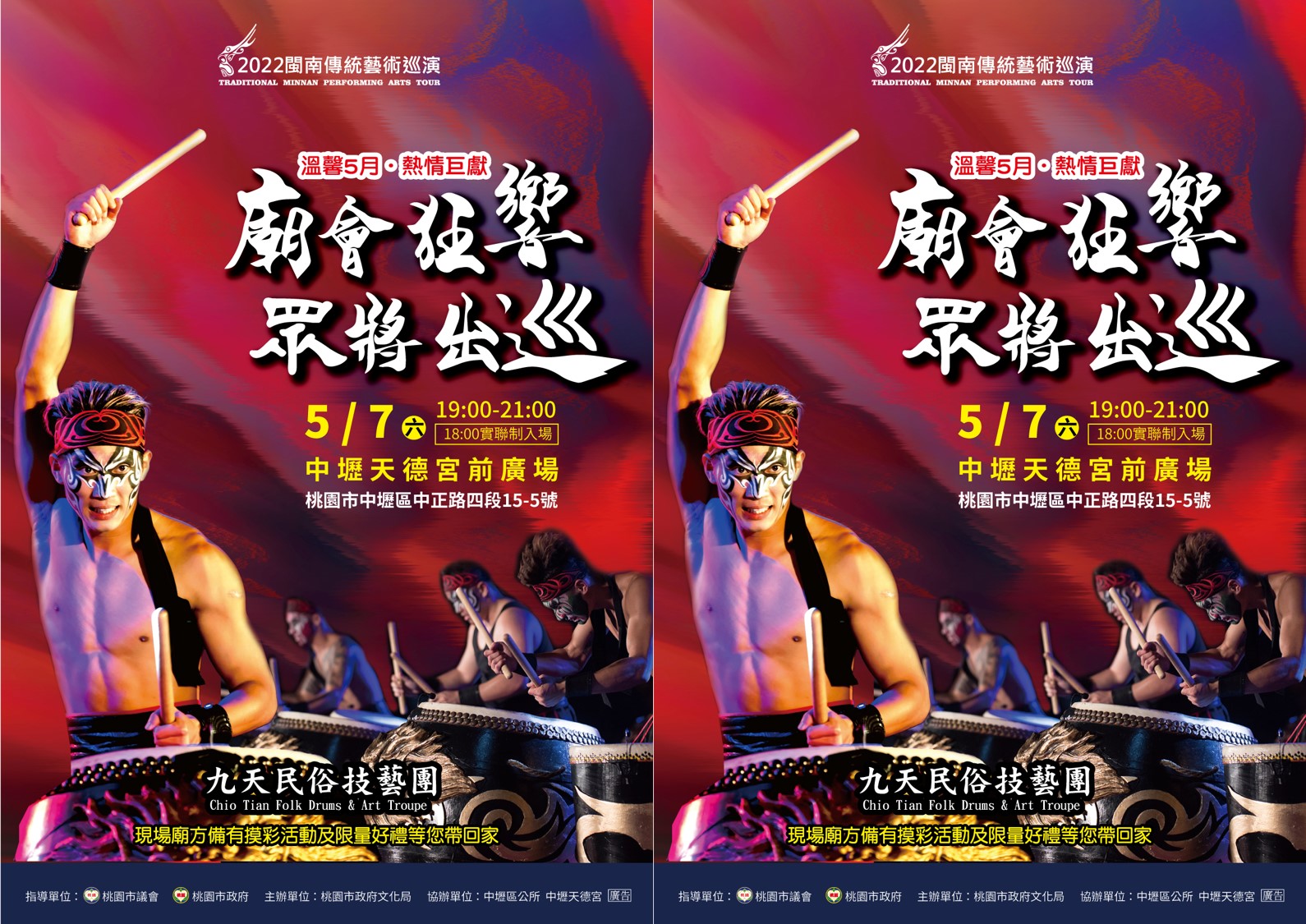 桃園市政府文化局邀請了九天民俗技藝團參與閩南傳統藝術巡演,將於2022/5/7在中壢天德宮前廣場表演《廟會狂響 眾將出巡》,晚上七點準時開演!當天更會邀請采風樂坊同台演出,融合搖滾與電子元素的音樂,共計2小時磅礡演出,讓桃園市民朋友一起感受震撼!