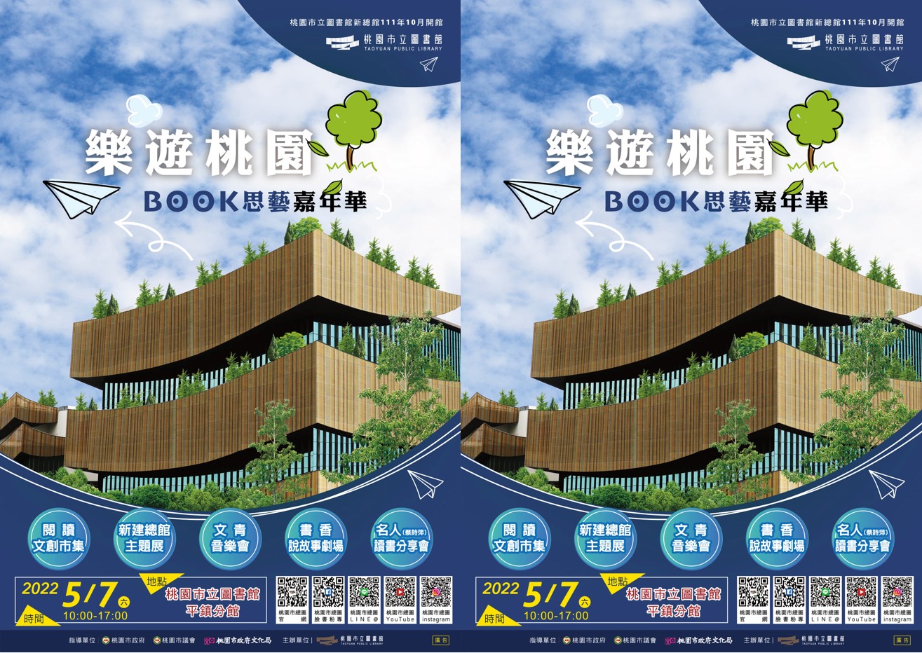 桃園市立圖書館平鎮分館在2022/5/7(六)舉辦「樂遊桃園BOOK思藝嘉年華」,從10:00~17:00,五大精彩活動包括:新建總館主題展、書香說故事劇場、名人讀書分享會、閱讀文創市集,以及文青音樂會。同時為了慶祝母親節,當天也有有獎徵答活動可以將精美小禮物帶回家喔!