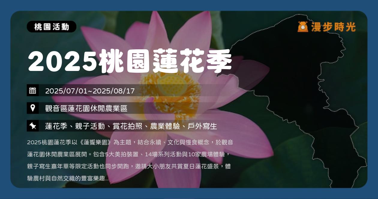 2025桃園蓮花季活動的時間為2025年7月1日~2025年8月17日,地點在觀音區蓮花園休閒農業區。2025桃園蓮花季以《蓮饗樂園》為主題,結合永續、文化與慢食概念,於觀音蓮花園休閒農業區展開。包含5大美拍裝置、14場系列活動與10家農場體驗,親子寫生嘉年華等限定活動也同步開跑,邀請大小朋友共賞夏日蓮花盛景,體驗農村與自然交織的豐富樂趣。